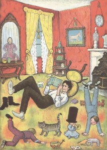 This book is a hagiography – Abraham Lincoln in his most heroic light. And he is an engaging and inspiring character for the young. In the various events of the book Abe demonstrates great moral strength and integrity, backed by a willingness to work hard for what is right. From a humble start he rose through talent, brains and hard work to the highest office in the land. It’s all heady stuff, classic Americana, which to our jaded, revisionist eyes may seem laughable, if not totally suspect. When presenting history to children, however, we must remember that there is still value in a bare-faced presentation of all that America fancies itself to be… whether or not the nation has lived up to its own hype. Abe’s defense of a Native American during the Indian Wars, and his stance on slavery were sufficiently forward-thinking to make his story palateable and admirable to modern taste. And, thankfully, the instances of Lincoln’s eccentricities and sense of humour prevent him from seeming altogether too saintly and remote.