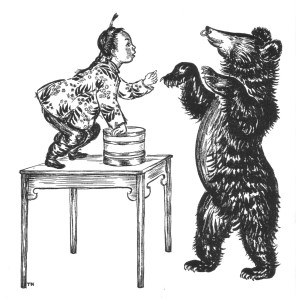The story is not heavy-handed or moralistic. It is greatly buoyed by the fascinating details of Chinese life and of the fair, but its real strength lies in the colourful and complex character of Mei Li herself. Mei Li, with the perky ‘candle-top pigtail’ on top of her head, is a youngest child and a girl too, well accustomed to being underestimated, but she counters this with courage, pride, bravado and stubborn determination. She is kind enough to give a precious penny to a beggar girl. She is impulsive enough to spend a penny on firecrackers, although she’s too frightened to set them off herself – she hides while her brother lights them. And she is not above a little vanity when she is told, as she has probably suspected all along, that she is royalty. The situation and events of the story – from a close encounter with a performing bear to a ride home on a camel – will be foreign to today’s children but the endearing character of Mei Li, and her emotions throughout her adventures manage to ground the story in the familiar.