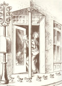 McCloskey’s book gives a duck’s-eye view of the city, and gives a lovely account of how birds can find a home amid the concrete, cars and noise. The birds speak to each other, but otherwise behave as birds do. Boston’s landmarks are featured prominently, which would provide a thrill for readers who know the city. (Depicting the city circa 1941 of course.) And it’s amusing to see the surprised reactions Mrs. Mallard gets as she leads her eight ducklings down the sidewalk.