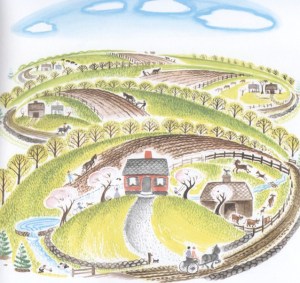 Terrific illustrations, and a really lovely read, though some may be irritated by the simple country = good, city = bad lesson. The point is taken to an extreme: the house is neglected and abandoned in the city, but cared for and loved in the country. Some may roll their eyes at this easy moralizing, but it didn’t bother me too much. It’s an environmental tale, far ahead of its time.