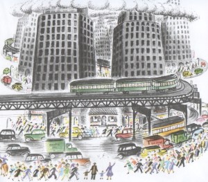 There is a lot here to take in, for the curious child. One drawing shows the phases of the moon, and the changing seasons are described in charming detail. When the cars and roads start to invade, one can follow the steps in highway paving, and there’s a fair parade of trucks involved in the construction of the skyscrapers. The intense detail in the busy, busy city scenes will also draw in the reader for closer inspection of people, elevated trains, and crowded subways. And of course the evolution from horse and carriage to early automobiles, and later to more ‘modern’ cars will be extremely interesting for some.