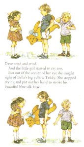 Who can’t identify with a child losing their favourite possession? It’s sheer tragedy in the making, at kid’s-eye level. And the relief in getting him back is wonderful, abetted by a very caring and kind big sister. An endearing snapshot of family life, including sister Bella, baby brother Joe, and Mum and Dad who search in vain for the lost dog.