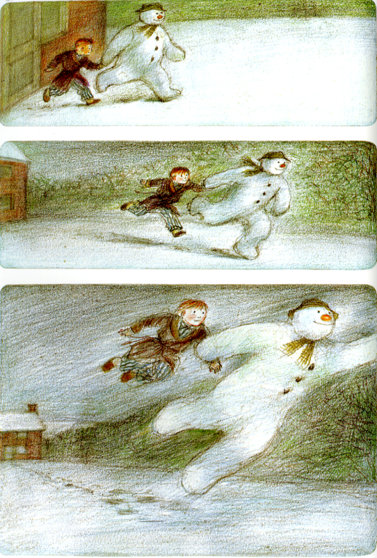 A boy builds a snowman. In the middle of the night he goes out to visit it and finds the Snowman has come to life, courteously tipping his hat to the boy. The boy shows him around the house while his parents sleep. The Snowman is particularly delighted by the electrical lights, but the boy must caution him to stay away from the fireplace, the radiator, and the stove. After some further fun and messing about they share a midnight snack. Then the Snowman takes the boy’s hand and they fly over the countryside. Dawn breaks, they return home, and when the boy gets out of bed again he finds that his Snowman has melted.