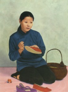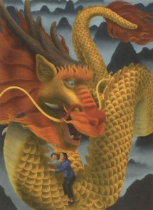 The gorgeous illustrations are at once fantastical – especially the glowing, ornate dragon – and quietly everyday – the scenes in the home, the simple moments between people. The successful and sometimes startling marriage of these two elements successfully brings the story to life and carries the magical right into the real world. (For example: at the feet of the sad daughter working on her embroidery is one of those very familiar red pin cushions that are in every shop in every Chinatown in the world today!)