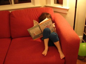 P.S. On the same general topic of encouraging your child to read, I’ve just finished reading Jim Trelease’s The Read-Aloud Handbook. I’ll probably write more about this book another time, but his position is that we should read books to our children from their first days of life right through to teenagerhood, for as long as they’ll sit still for it. He argues (strenuously) that we should not stop reading aloud when our kids learn to read for themselves. Having a scheduled read-aloud time is a wonderful way for parents and children to share the reading experience, as well as being an avenue for you to introduce your child to more challenging works – classics and the like – which they may not pick up on their own.