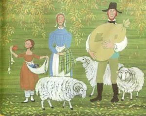 This is the first sentence, and if it sounds like it’s starting in the middle of the story, it is. The story of the ox-cart man and his family is fully cyclical, rolling with the seasons and the crops. At the beginning we see them loading up the products of their labours – wool from the sheep, a woven shawl and mittens knit from the sheep’s wool, handmade candles, shingles and birch brooms, linen made from flax they grew, potatoes, apples, honey and honeycomb, turnips, cabbages and maple sugar… even a big bag of goose feathers. All the products of their farm and their hard work. In Portsmouth the man sells everything, even the bags, barrels, cart and ox, buys a few essentials (very few) and walks the long, ten-day walk home.