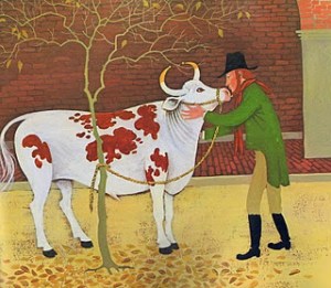 Simple and charming, a true tale of self-sufficiency, hard work and the passing of the seasons. Barbara Cooney’s folk arty style is absolutely perfect for this story, and imbues it with both dignity and whimsy. I particularly liked the page in which the man kisses his ox goodbye. I also liked the fact that, along with some essentials, the man spends a little of his hard-earned money on a bag of peppermint candies, to be doled out through the winter as a special treat.