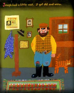 I like the message of this story, but the illustrations are what make this a really terrific book. Simms Taback paints lively scenes from Joseph’s daily life with amusing details and a quirky use of collage. As well, the pages in this edition have been die-cut so that you can peek through to the next page, and what his overcoat will turn into next.