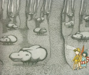 Each poem describes a jumbled up creature/plant on Scranimal Island – the Rhinocerose, Spinachickens, the Porcupineapple, Hippopotamushrooms, Bananaconda, etc. Two small children explore the island, observing each fantastical creature from afar before magically tumbling back home again. (The author helpfully provides pronunciation guides at the bottom of each page, for many of the names are tongue-twistery.)