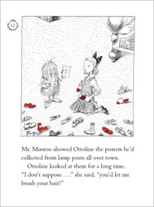 Ottoline’s relationship with Mr. Munroe is that of equals. When she is unintentionally neglectful of him he goes up to the roof to sulk in the rain, but after much thought about their history together he quietly returns, all forgiven. There are quiet lessons here about friendship and thoughtfulness, and things that don’t need to be said – Mr. Munroe doesn’t like having his hair brushed, but he lets Ottoline do it because it helps her to think. And when she gets a little misty over a postcard from her beloved parents he brushes her hair because he knows it will make her feel better.