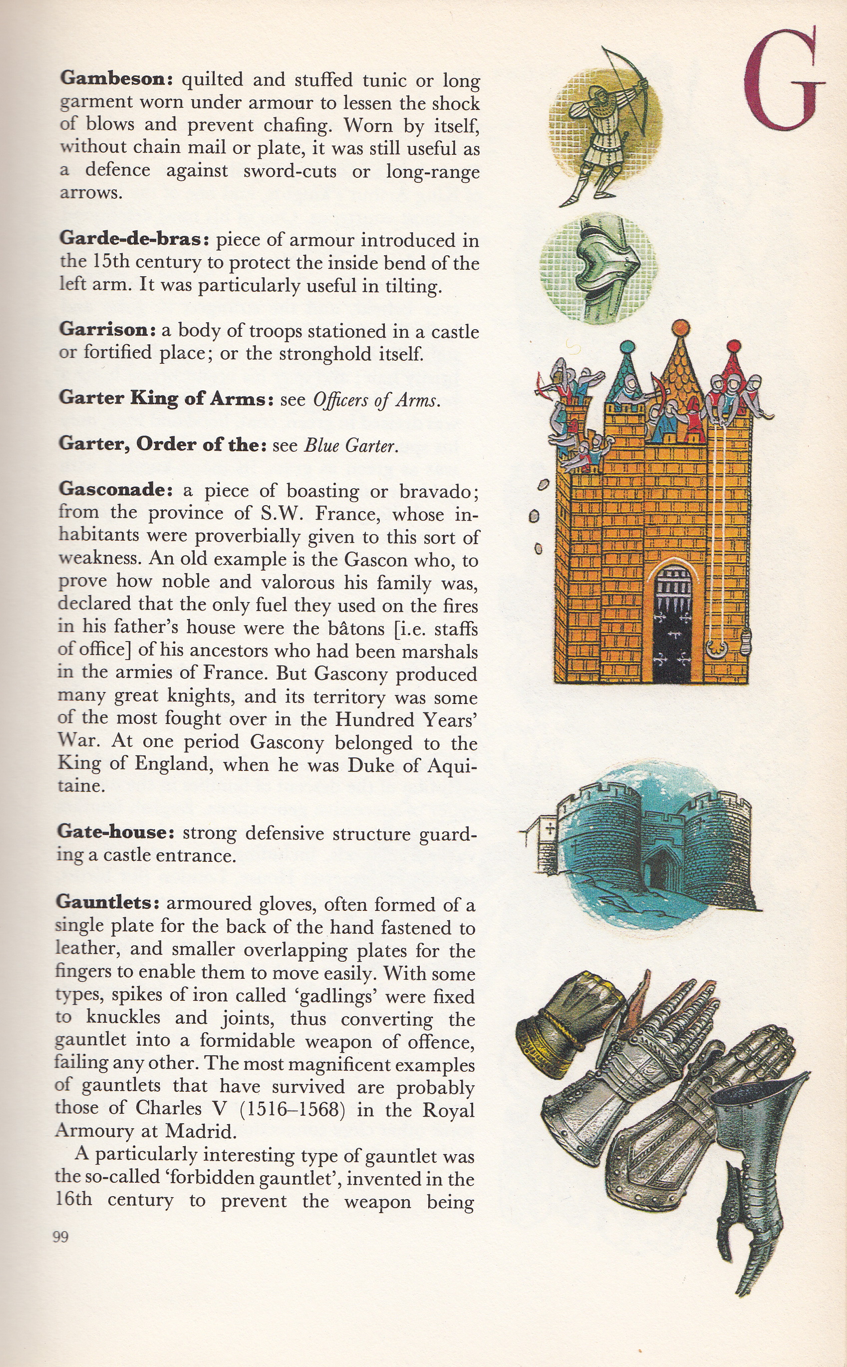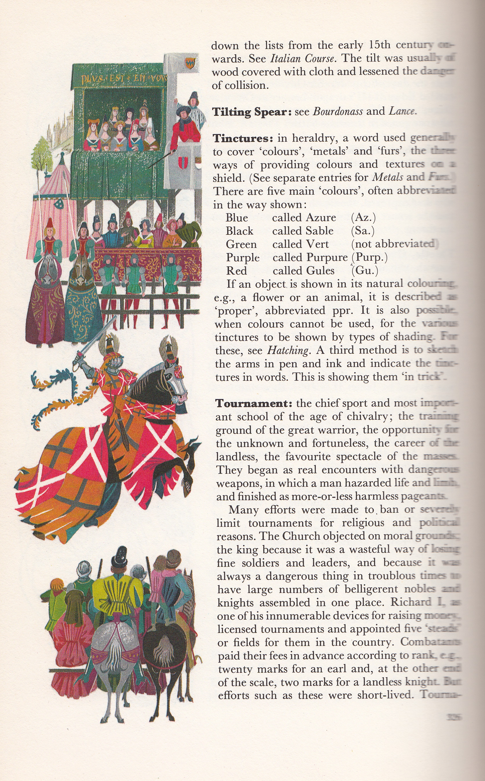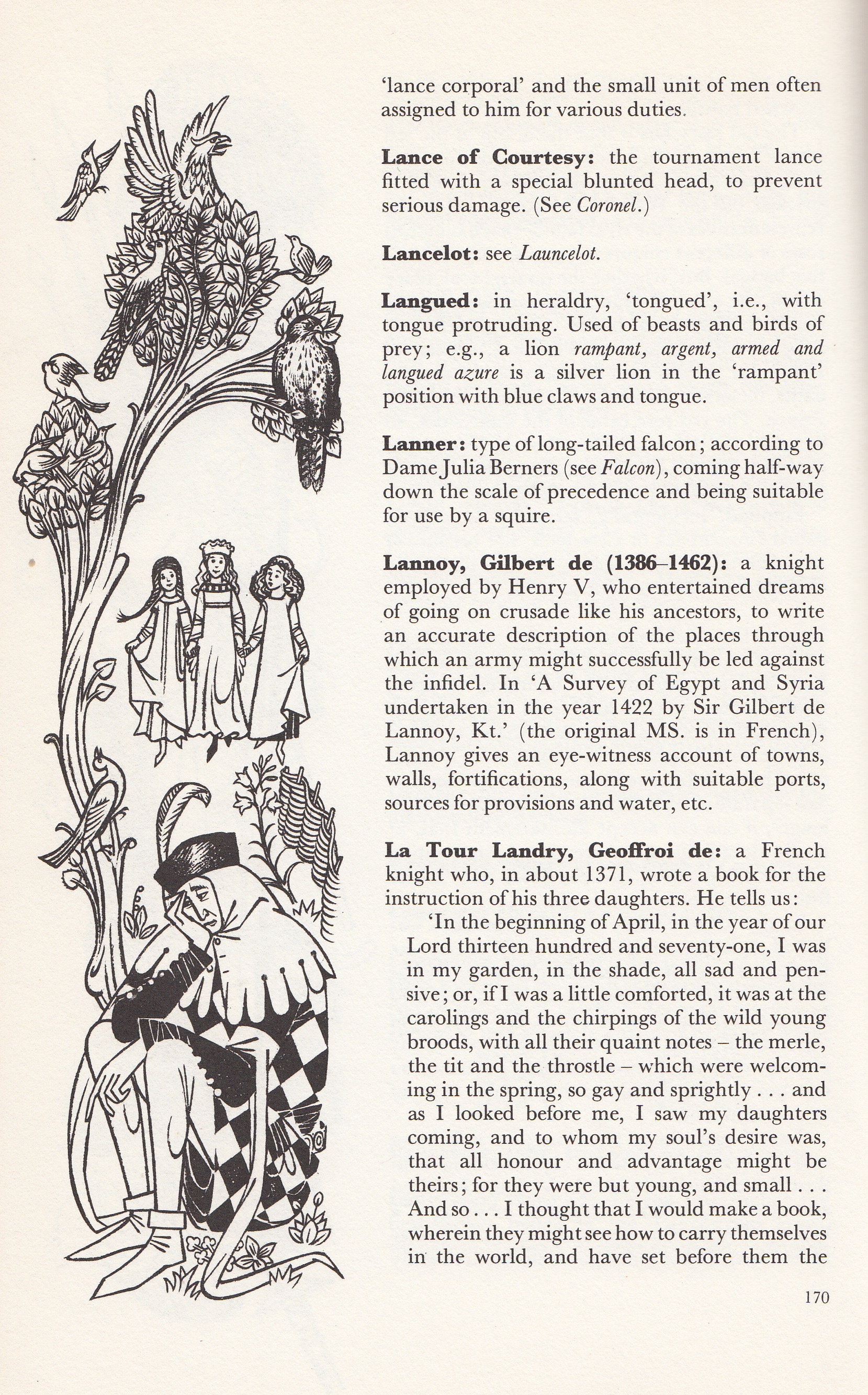 A dictionary for all things related to knights and chivalry. Written for a young audience, with excerpts from many literary works relating to the topic, from Chaucer to Shakespeare to Tennyson to T. H. White. Entries include the names of specific pieces of armour and weaponry, short biographies of famous figures from history and literature, accounts of noteworthy battles and crusades, terms of heraldry, descriptions of castles, jousts, sports, recreation, clothing and general medieval life.