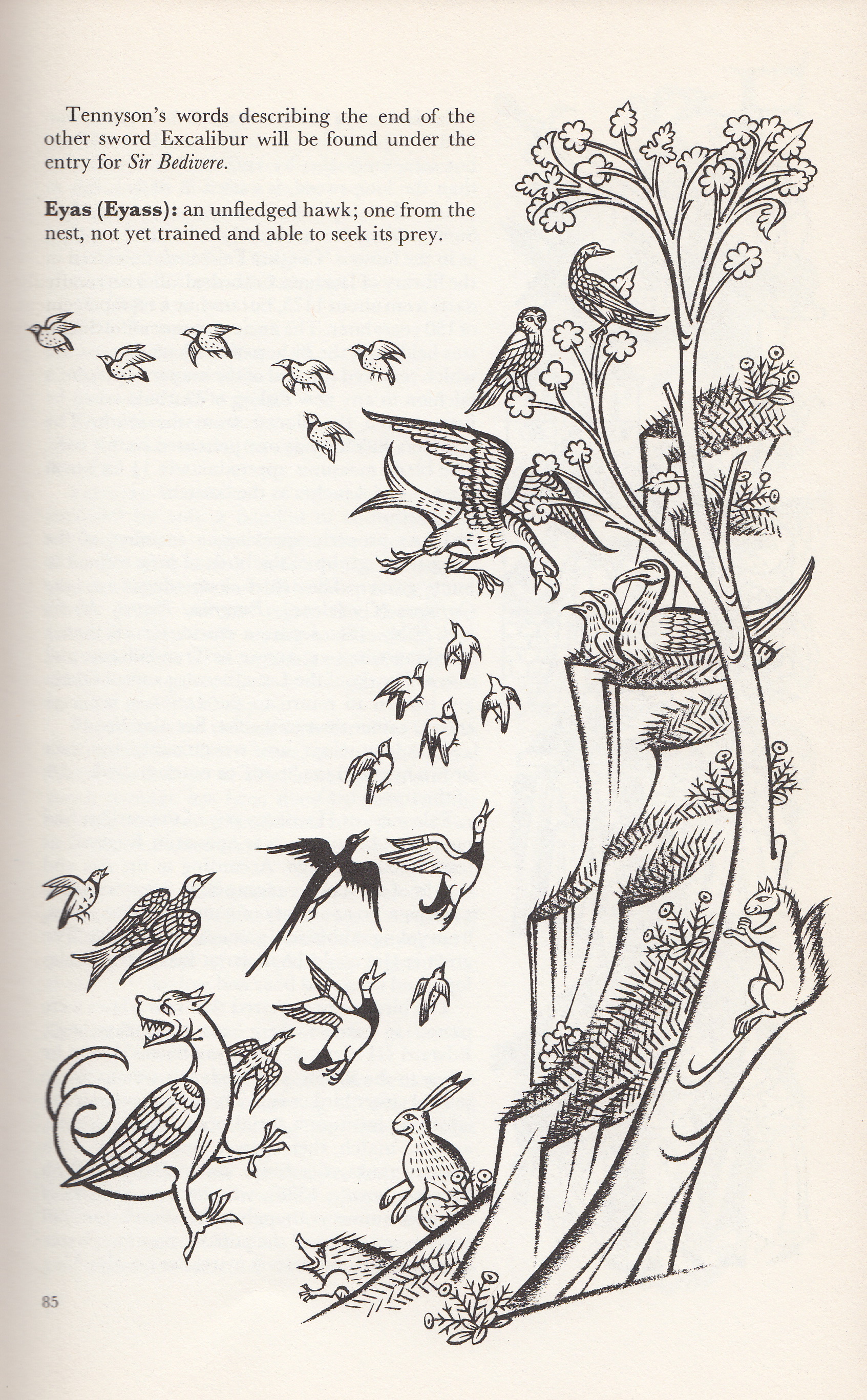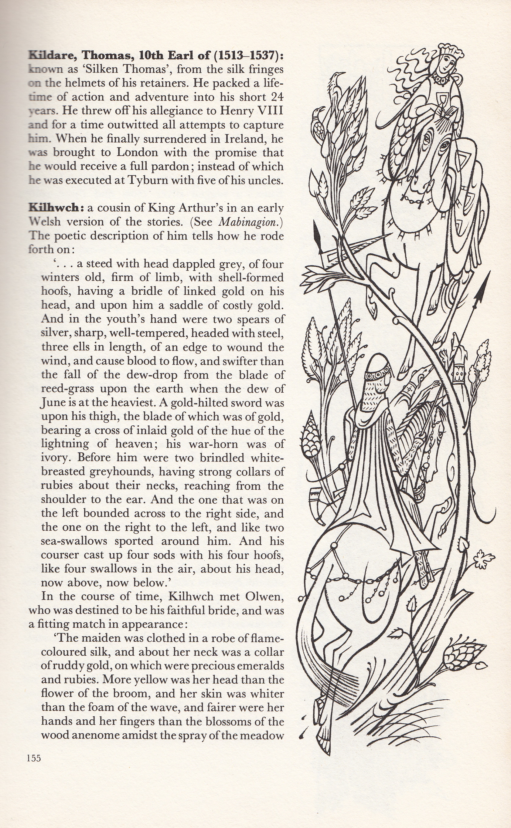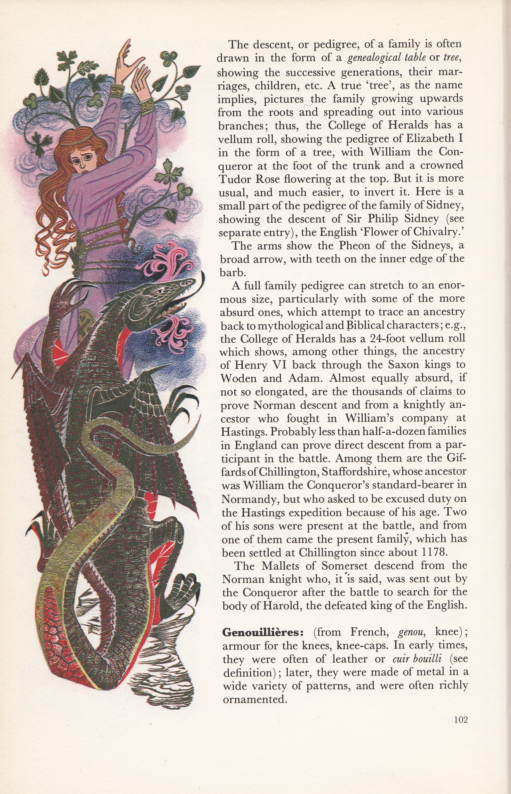A dictionary for all things related to knights and chivalry. Written for a young audience, with excerpts from many literary works relating to the topic, from Chaucer to Shakespeare to Tennyson to T. H. White. Entries include the names of specific pieces of armour and weaponry, short biographies of famous figures from history and literature, accounts of noteworthy battles and crusades, terms of heraldry, descriptions of castles, jousts, sports, recreation, clothing and general medieval life.