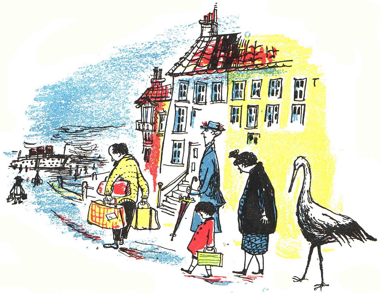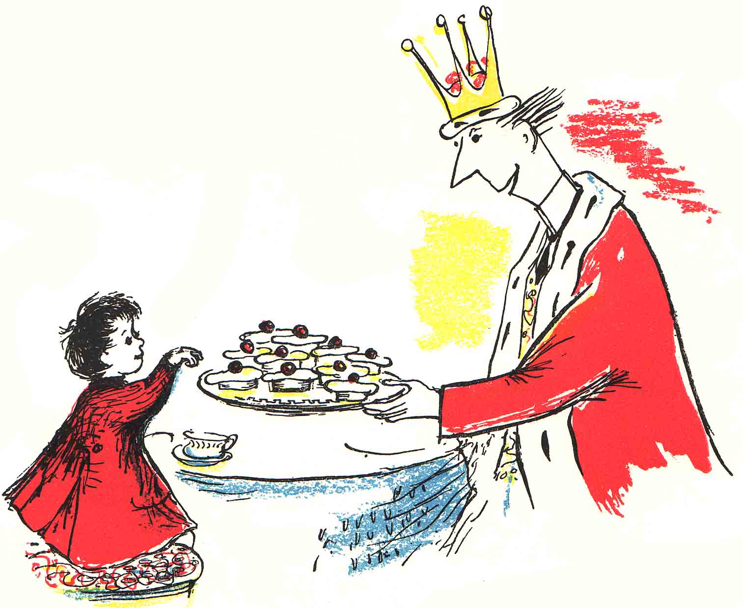 There is a lot of text on each page, but the story moves along nicely. The loose pen and ink illustrations reminded me of Ludwig Bemelmans’ Madeline books. (The general loopiness of the plot is also very reminiscent of Madeline.) The full-page drawings are wonderful, particularly the one of them flying over London by night and another of the royal table filled with goodies. (As in every good children’s story, special care is given to describing the treats.)