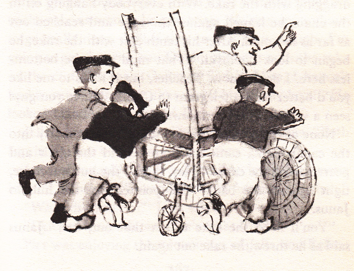 This book is a little on the long side, so the biggest challenge for readers will be sticking with it, but the children’s little adventures begin right away, and the action keeps humming along with moments of great drama and suspense. The illustrations by Maurice Sendak (see below) perfectly match the author’s style and will help children visualize just what is going on, ie. the size of the wooden wheel, what a tin man’s cart looks like, etc.