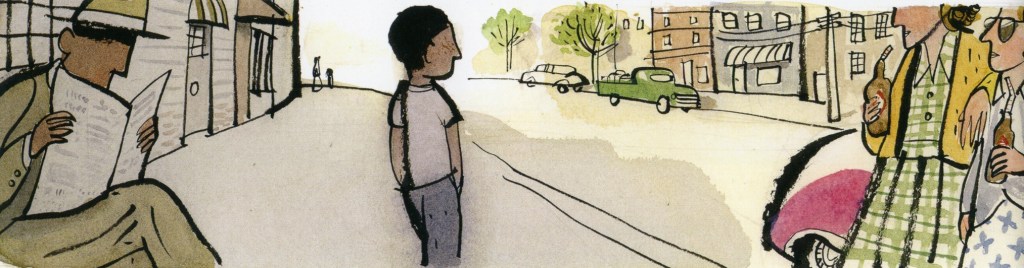 This is a quiet, understated story about a boy’s life in the 1950s. Notable more for what’s not said than said, this simple book perfectly captures the rhythms, sights, and sounds of this boy’s life. The watercolour scenes match his narration perfectly, filling in many of the gaps in his telling.